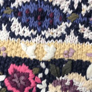 Dark navy blue with cream, blue, pink, lilac floral knit patterns. Hand knitted.