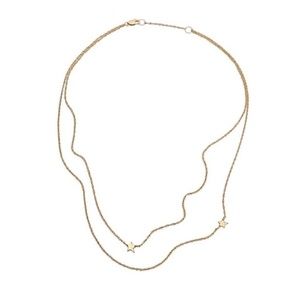 double row necklace features two dainty chains connected at he claps and is punctuated with two tiny star charms