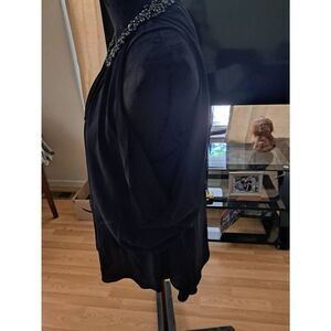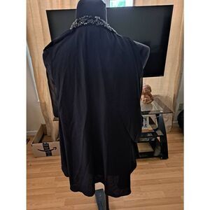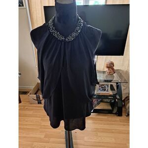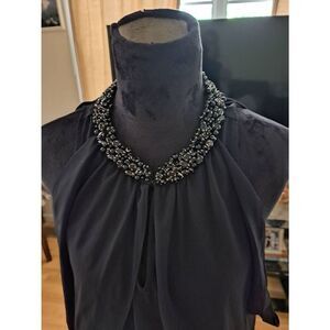 Women’s size large blouse by Jennifer Lopez. Black with a beaded neckline and sleeveless tank-style base featuring a soft, fluttering butterfly overlay sleeve. Stylish front keyhole detail. Lightweight and flowy. Made from 100% polyester.