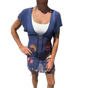 Channel that early 2000s boho-glam vibe in this ultra-rare Jenny Han mini dress, size XS. Crafted from 100% silk with a 100% cotton lining, this sheer periwinkle beauty features bold embroidered florals, heart motifs, and a tie-front neckline. A true Y2K gem perfect for layering over a tank and shorts, or styling as a beach cover-up.