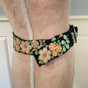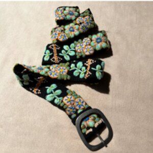 Gorgeous embroidered belt designed to be versatile with 5 sets of holes 2" apart so it can be worn at the hip or at the waist. You will love the slight stretch that conforms to the body after a few days of wear - just like your favorite pair of jeans! Sold at Anthropologie and Free People.