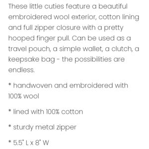 Handmade. High quality. Great for a gift. I love this for toiletries, jewlery, hair accessories or travel. Really adorable pouch used for any occassion. could be used as a clutch as well!