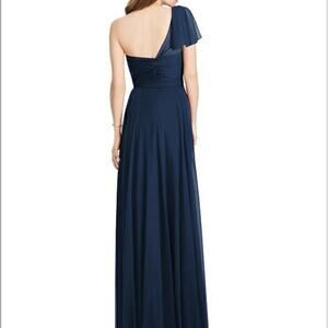 Dreamy, romantic overtones highlight the soft look of this full-length one-shoulder lux chiffon dress. A rouched bodice with a sweetheart neckline shows a knot detail, and flutter sleeve detailing joins a belt in creating a multi-faceted evening dress.