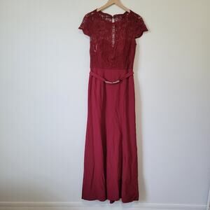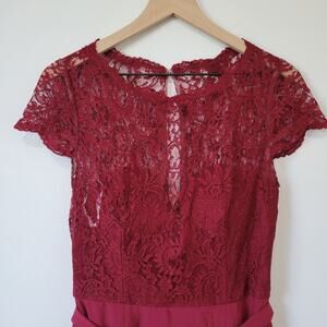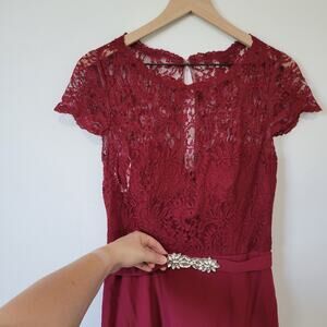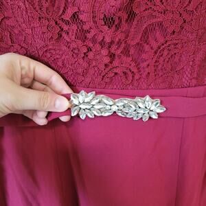Features: burgundy, red, wine, lace top, belted, rhinestone, zip closure, hook and eye.