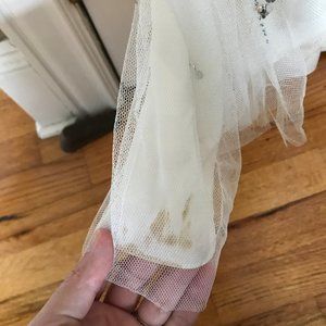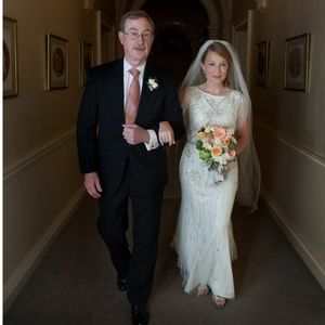 Jenny Packham off-white polyester satin covered in net with silver beaded roses trailing down the front and back. Short train which can be bustled in the back.