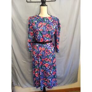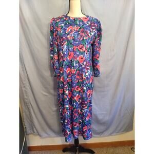 Jenny Petites Vintage Floral Dress. Purple, blue, pink and green. Romantic and Sweet. Also looks good belted (belt not included). Size 14. 21" pit-to-pit, 20" across the waist, 21" across the hips, and 43" long.