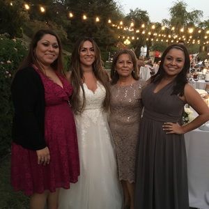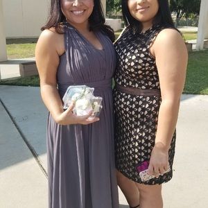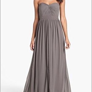 Worn just once this is the convertible Aidan in charcoal. I’m 5 feet tall, had a 3 inch heel and was just about at the floor so I would say hemmed for a 5’4 - 5’5. I added some of the wedding pictures so you can see it on - I wore it halter style. I’m an 8-10 in regular clothes.