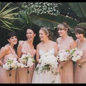 Jenny Yoo Collection features a shirred strapless bodice with a sweetheart neckline for a universally flattering look. The floor length gathered A-line skirt features convertible panels that can be raised and manipulated to create alternate necklines and skirt details. The dress is fully lined with a center back zipper.Pink Cameo - (Blush) Size 10 (we have 1left) Worn Once. Money has been deducted from the price for dry cleaning.