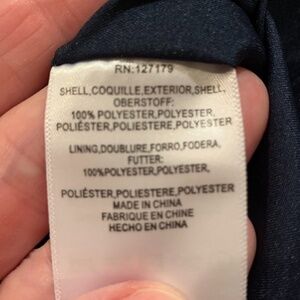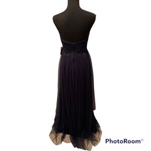 Jenny Yo Collection Annabelle Convertible Dress in navy. Shirred strapless bodice with sweetheart neckline. Floor length gathered A-line skirt. Women's size 10. The detachable tulle sash is missing and the tulle in back is damaged where it was stuck in zipper. One of the convertible tulle panels is also damaged in the back. Dress in new with tags.