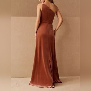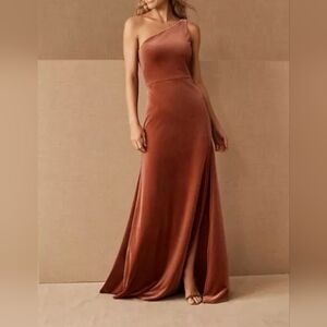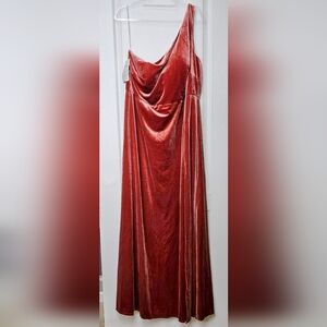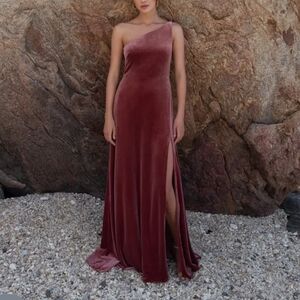 Jenny Yoo Cybill One-Shoulder Side-Slit Stretch Velvet Gown, ENGLISH ROSE sz 26