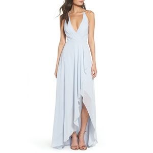 Fluttery ruffles frame the thigh-high slit on this ethereal surplice gown cut from ultrabreezy chiffon for romantic drape and flow.