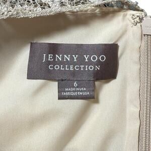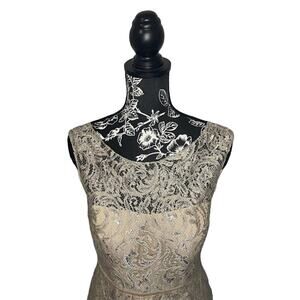 Gently worn sleeveless cocktail dress from Jenny Yoo Collection in the "Harlow" style. The colorway is cream / champagne with silver metallic detailing and sheer lace overlay.
