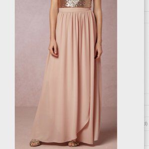 Love this skirt, just can't figure out how to wear it again (worn once as a bridesmaid). Hemmed to fit me (5'4") wearing 4in heels. Slip underneath that goes to roughly the knee and a slit/wrap kind of style (gorgeous movement but looks closed when standing still). Purchased at bhldn.
