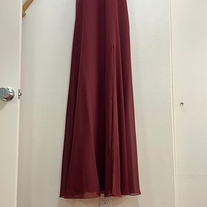 The Kayla chiffon dress has a clean, chic halter neckline, and slim A-line skirt with a flirtatious slit. The delicate spaghetti straps hook at center back for a flattering and alluring detail.