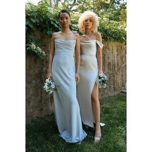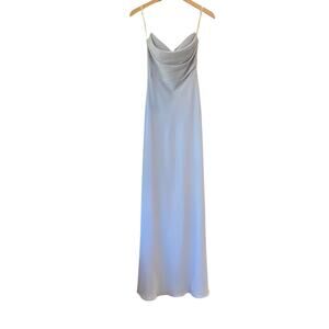Jenny Yoo Liv Dress in Whisper Blue. Size 0. Features pebbled crepe fabrication, soft cowl neckline, draped bodice detail, fully boned bodice with bust cups, bias cut skirt, center back zipper, fully lined, maxi length. 100% polyester. Style 22316. Brand new, never worn, NWT / New with tags.