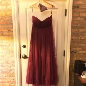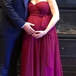 Beautiful Jenny Yoo maternity gown in black cherry. Worn once. Altered to fit 5'8", taken in slightly at the bust. Extra fabric attached to dress so you have the ability to style it multiple different ways (sash, straps, halter, etc).