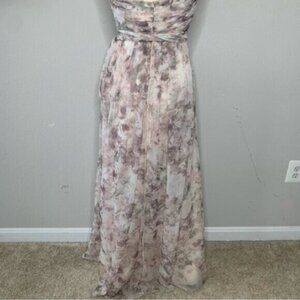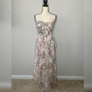 This elegant floral maxi dress exudes romance and sophistication. The strapless sweetheart neckline adds a feminine touch, beautifully complementing the ruched bodice that enhances the silhouette. Crafted from a delicate, lightweight chiffon fabric, the gown drapes gracefully to the floor, creating a soft and ethereal effect. The floral print, featuring muted tones of blush, mauve, and ivory, lends a timeless and dreamy aesthetic. A fitted waistband cinches the waist for a flattering shape, while the flowing skirt adds movement and grace. The back features a structured design with a concealed zipper closure for a seamless finish.