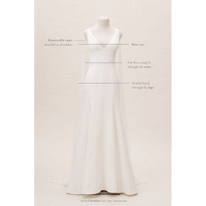 Clean and modern, this elegantly fitted gown features a v-neckline, dramatic open back, and princess seaming for an especially flattering silhouette. Wear it with the floaty, detachable shoulder capes for ethereal drama, or without for an understated look that’s incredibly chic. By Jenny Yoo.