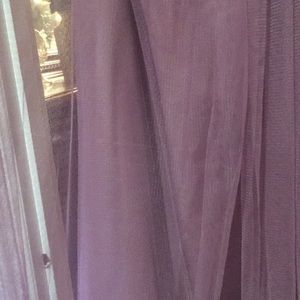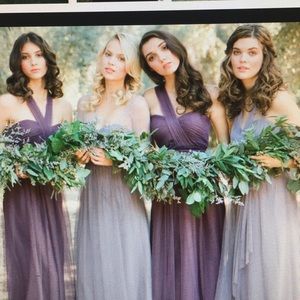 Beautiful Jenny Yoo convertible tool dress worn 1 x as a bridesmaid . Has attached sash never used still in bag in which you can style 15 different ways . Normal wear on the bottom of the dress after a wedding (see picture) Some picks in the dress but with the tool material it is not as noticeable . Beautiful dress!!! I have the dress in a size 4 (left side) and a size 2(right side). You have the length to hem the bottom of the dress. Color is more of a mauve purple .