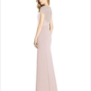 Assemble a fashionable wedding party with this full-length crepe bridesmaids dress with sweetheart neckline. An hourglass shape flatters and shows off a marquis lace cap sleeve bodice with a keyhole back, while a trumpet skirt offers proportion and a flowing look.