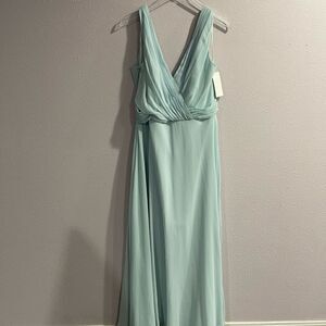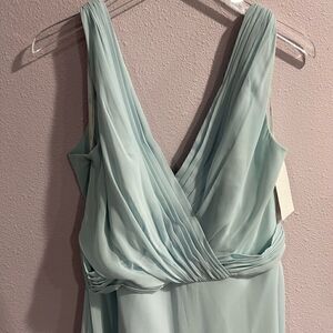 Tags still attached. Style JP1019. Chiffon style. Maxi dress. Lined. Zips in back. Morning sky coloring which is a light blue coloring. Faint pull at back otherwise great condition
