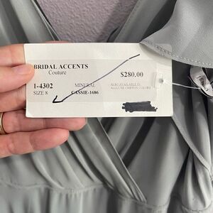 Mineral green gray coloring. Cassie style dress. Style 1686. Tags still attached. Zips in back. Chiffon. Faint pull and mark at bottom not noticeable unless close up. Haven’t tried to wash/treat. Back hook/eye closure for button is off on and need to be tacked down and one is loose. Just tried on.