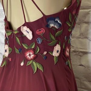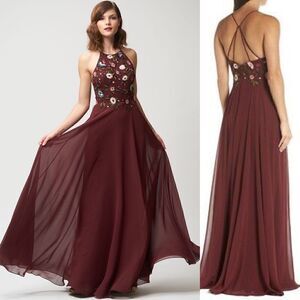 Make an enchanting entrance in this romantic gown fashioned with a blossom-embroidered bodice, strappy back and sweeping chiffon skirt. - 62" length - Hidden back-zip closure - Jewel neck - Sleeveless - Spaghetti straps - Lined - 100% polyester - Dry clean or hand wash, line dry - Imported