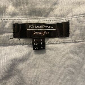 This Jennyfer button-down shirt in size small is a lightweight and stylish wardrobe staple. Designed in a soft blue cotton fabric, it features a front tie detail that adds a casual, feminine touch. Two front chest pockets complete the look, making it perfect for everyday wear.