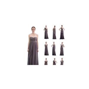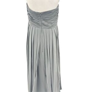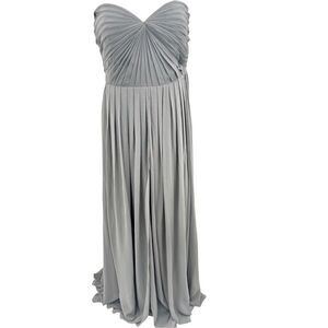Jenny yoo floor-length gown. The dress is a muted gravy color and features a pleated bodice with gathering at the center, creating a ruched effect. The skirt is flowing is made of a lightweight fabric, giving it an elegant and airy appearance. The overall style is formal and suitable for occasions such as weddings or evening events. Size 12