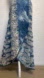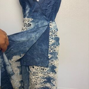 Chic denim maxi dress with white knit lace accents. Flattering V-neck wrap skinny strap design. Ideal for casual elegance. Vacation beach tropical wear. Size small. Vestido wildwood.