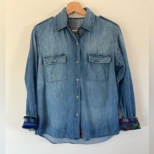 Jen’s Pirate Booty Distressed Lightweight Denim Button Front Embroidered Flip-Cuff Shirt