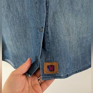Jen’s Pirate Booty Distressed Denim Button Front Embroidered Flip-Cuff Shirt