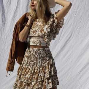Two piece skirt set in a cream, tan and brown boho print.