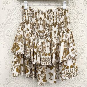 The skirt has a wide elastic smocked waistband, pull on styling, tiered layers, mini length, unlined.