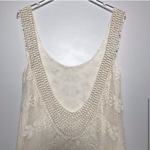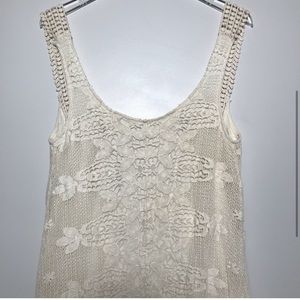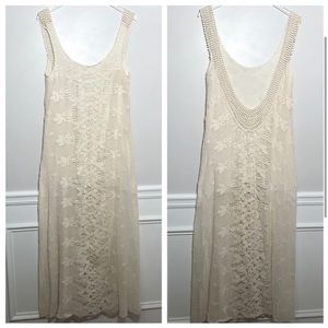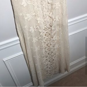 A beautiful full crochet lace pullover boho maxi dress with plunging back. Pit to pit measures approx 17" across lying flat and total length is 59". See last photo for small flaw in the strap, also the very bottom is a tiny bit discolored from dusting the floor, and this one doesn't have the connector in behind the neck like the model photo does.