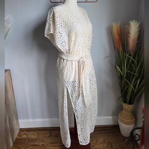 Jen's Pirate Booty, Ivory Floral Eyelet Belted Cover-up Midi Dress, Size Small
