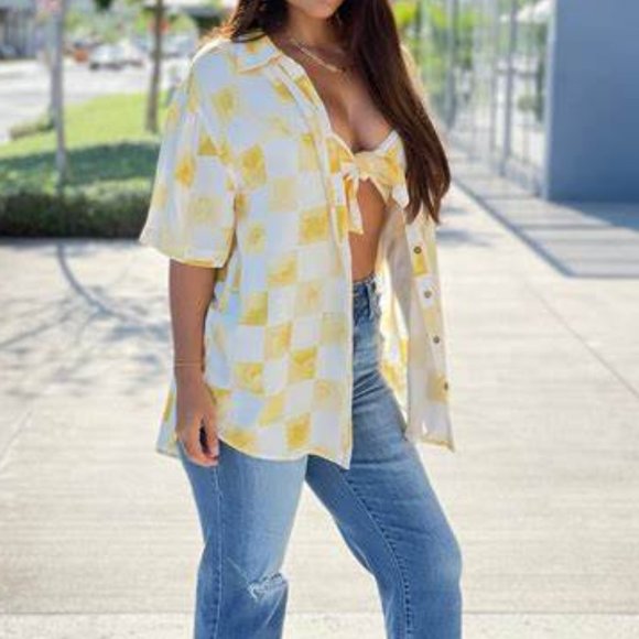 Jen's Pirate Booty Ocean Front Kapalua Short Sleeve Gold Check Shirt SZ M