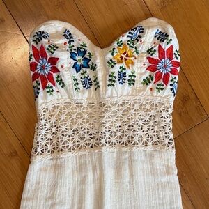 Elegant strapless white dress featuring colorful floral embroidery. Perfect for summer occasions.