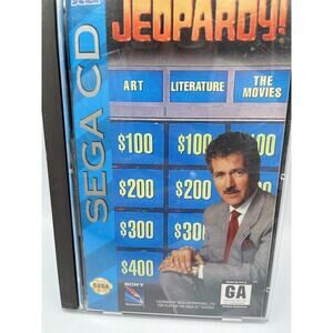 The product is Jeopardy for the Sega CD, released in 1994. It is complete in box (CIB) and the disc is in excellent condition. This version of the game is specifically for NTSC-U/C (US/Canada) region consoles. Published by Sony Imagesoft Inc., "Jeopardy!" is an E-Everyone rated video game that allows players to test their knowledge of various categories through interactive gameplay. This classic game is a must-have for collectors and fans of retro video games.