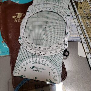 This vintage item includes three pieces related to air navigation. The set consists of a Computer CSG Slide graphic for calculating air navigation, a Jeppesen folding plotter for charting flight paths, and a Super Plotter for additional navigation assistance. Made in the United States, these tools provide essential support for pilots in planning and executing flights. The combination of these three pieces offers a comprehensive solution for aviation professionals and enthusiasts looking to enhance their navigation capabilities.