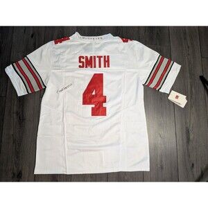 Brand new with tags! Jeremiah Smith #4 Ohio State Buckeyes White Jersey Stitched Men's adult size Small Super High Quality - All Stitched and Embroidered! Quick Shipping from USA - Receive 3-4 days after purchase! Armpit to Armpit Across the Chest Small - 22.5 Medium - 23.5 Large - 24.5 XL- 25.5 XXL- 26.5 XXXL - 27.5