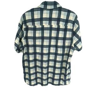 New with tags Jeremiah Back Bay Mens button down Short sleeve shirt. Blue and Ivory Plaid with textured dark blue stripes. Men's size Large. Measurements in photos. No rips or stains. Small pin hole in bottom of back shirt...see photo. Barely noticed it when I was measuring the back. Retails $98.Sold at Nordstroms.