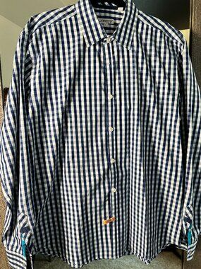 Elevate your wardrobe with this Jeremy Argyle NYC men's XL dress shirt, crafted from 100% premium cotton for breathable comfort and timeless style. Featuring a blue and white checkered pattern, this shirt boasts contrast turquoise cuffs and placket, adding a refined touch to your casual or business look. The classic button-up design and tailored fit ensure a flattering silhouette, while the original tag confirms authenticity. Perfect for office wear, dinner outings, or upscale casual events, this shirt was dry cleaned and worn only a few times, offering near-new condition at a fraction of the original $140 retail price. Ideal for those seeking designer men's shirts, cotton dress shirts, or NYC fashion staples.