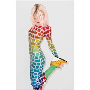 Iconic Jeremy Scott for Adidas maxi dress from the from the Fall/Winter 2012 collection. Covered in a colorful rainbow multicolor keyboard print. Body con style, long-sleeve, scoop neck and back. Stretchy mid wight fabric. Preowned condition. Light signs of wear throughout. No holes, stains, or tears.