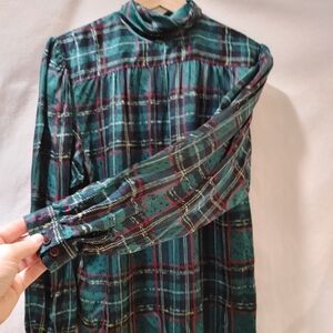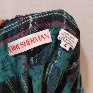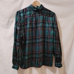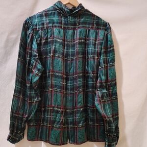 Jerri Sherman Silk Blouse Green Red Black Plaid Long Sleeve Size 4 Vintage