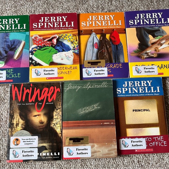 Collection of 7 Jerry Spinelli books. Includes popular titles. Stickers on front and some back covers.