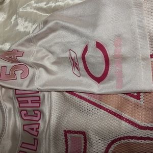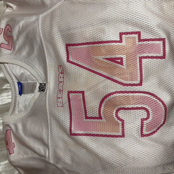chest 20 inches,pit to waist 14 inches. Chicago Bears Breast Cancer awareness girls pink # 54 Urlacher limited edition jersey. NWOT. ( B # 16 )