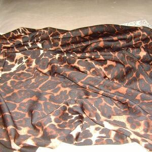 Jersey Knit Leopard Print Fabric in deep rich colors black, brown and tan. This stretchable fabric measures 1 yard and 3 inches (39 inches) and is 60" wide. This would make a great top or skirt. The quality is very good. I had someone to make a top for me out this fabric, and it is gorgeous. This was the remaining piece, as I always tend to over buy. Excellent condition.