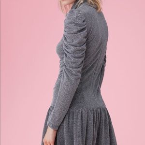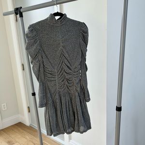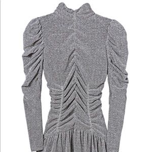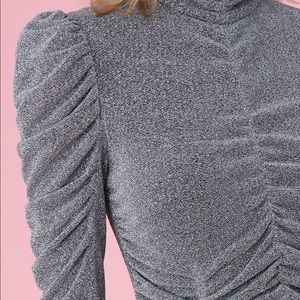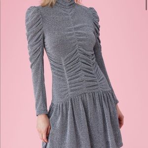 Victorian-inspired details meet modern shine on this long-sleeved dress. Its high neckline and statement sleeves complement its form-fitting ruched details. A ruffled hem adds movement to this style, day or night.