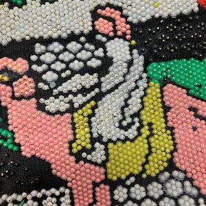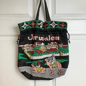 Jerusalem Beaded Drawstring Vintage Tote Bag Black Double Handle Handmade Israel